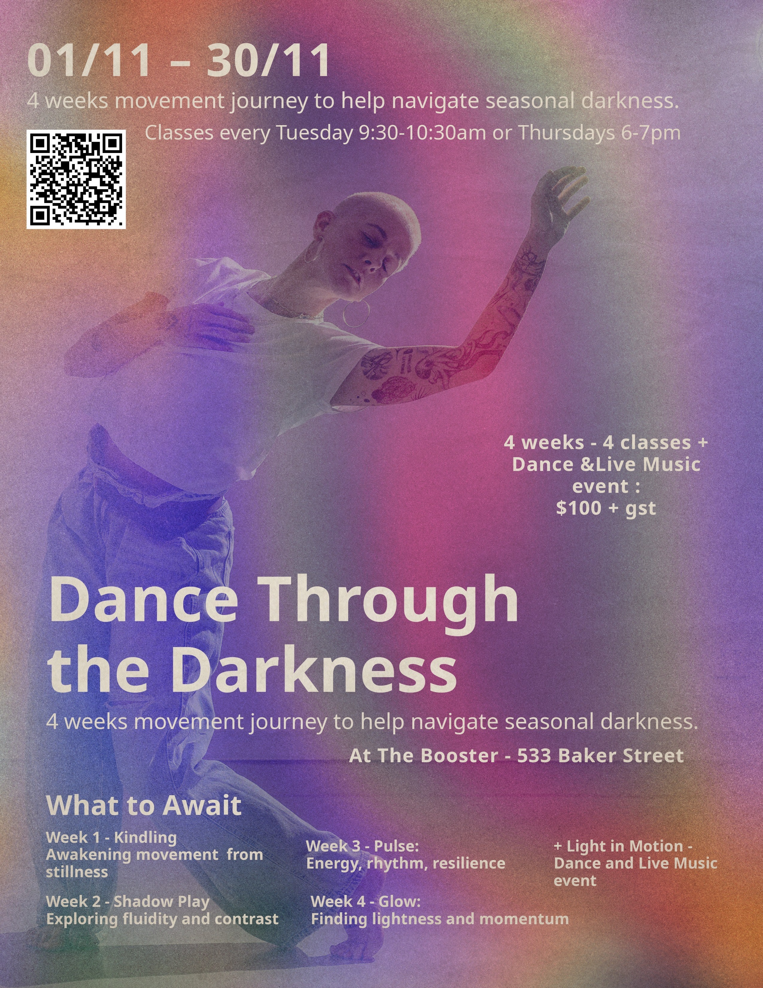 “Dance Through the Darkness” is a month-long celebration of movement, resilience, and reconnection led by Sophie Barbarics at The Booster. Each session is a creative response to the season’s quiet, inviting dancers of all backgrounds to gather, breathe, and transform winter’s heaviness into shared vitality.